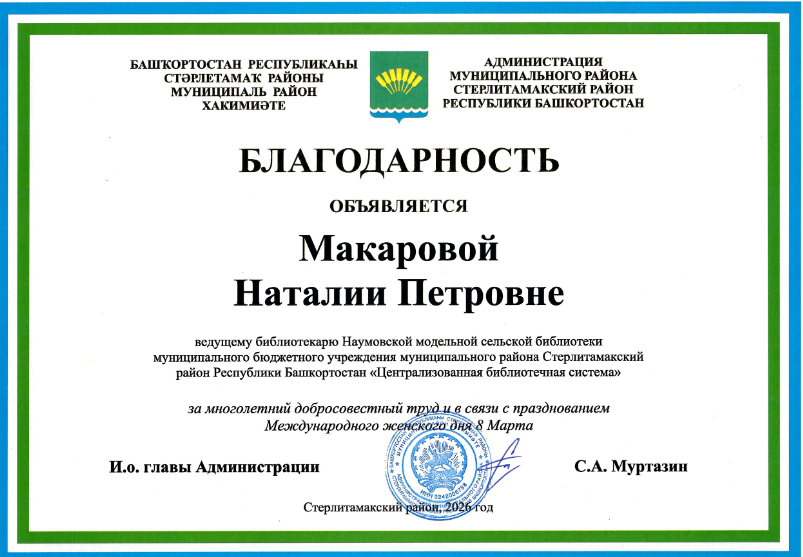 Благодарственное письмо, Макаровой Н.П.