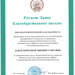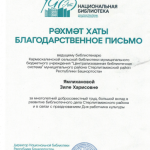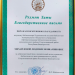 Благодарственное письмо от Национальной библиотеки Ново-Барятинской библиотеке