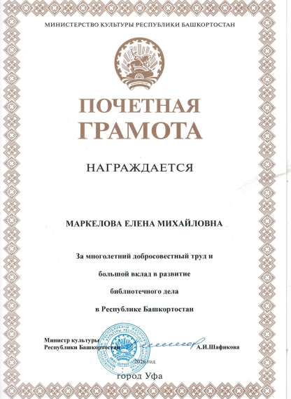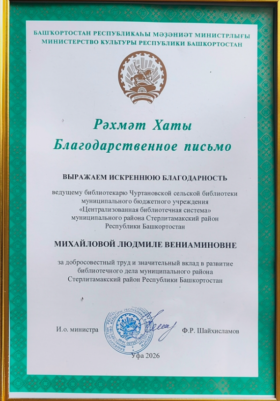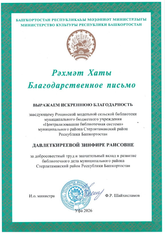 Благодарственное письмо от Министерство культуры РБ