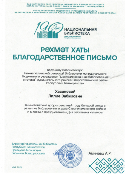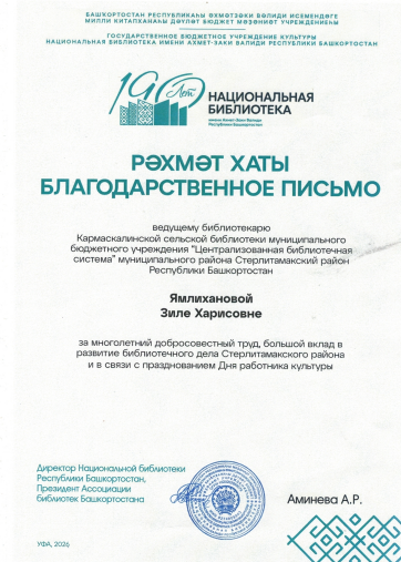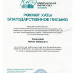 Благодарственное письмо от Национальной библиотеки им. Ахмет — Заки Валиди